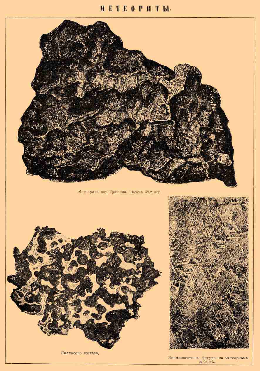 1. Метеорит из Грашина, весом 39,2 кг. 2. Палласово железо. 3. Видманштетовы фигуры на метеорном железе.