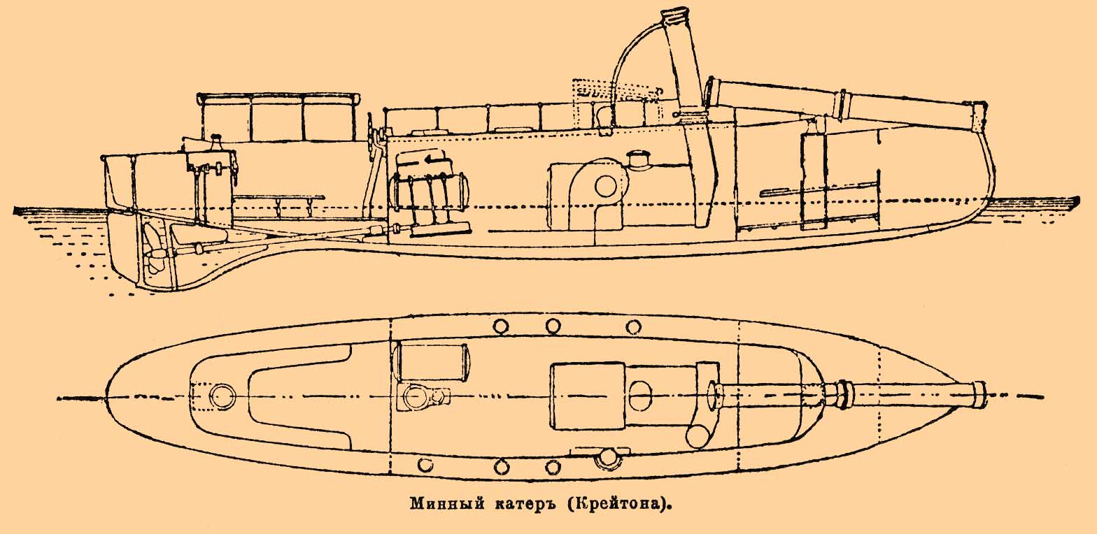 Для стрельбы минами у подобной миноноски имеется на носу под палубой М. аппарат, заряжающийся с казенной части, для чего за аппаратом палуба снижена. Под аппаратом помещены по борту воздухохранители, насос воздушный; тут же помещены и вещи команды. За этим отделением — котельное отделение с одним котлом (локомотивного типа почти на всех миноносках); позади котла — машина одновинтовая, большей частью "Compound". Дымовая труба помещена не в диаметральной плоскости, чтобы не мешать вдвиганию мины в аппарат. За машинным отделением — помещение для командира, с небольшой башней, в которой поставлен штурвал; на самой корме имеются иногда еще две койки для матросов. Команды на миноноске — 6 человек; офицеров — 1 (командир). Размеры русских миноносок: длина от 65 ' до 80'; ширина от 8' до 10'; углубление серединой — от 2 1/2 ' до 4' (винт углубляется до 6'); водоизмещение от 20 до 35 тонн, причем запаса угля около 3 1/2 тонн; скорость хода при мощности машины до 250 индикаторских сил (JHP) доходит до 16 узлов. Корпус построен из мягкой стали, толщина которой изменяется от 1/8 " до 1/16 ". Для защиты от потопления вся миноноска разделена 6 поперечными непроницаемыми переборками на 7 отделений; вода из отделений выкачивается 3—4 эжекторами Фридмана (выкачивающими до 11 тонн воды в час). Всего в России (в 1895 г.) миноносок около 100 (86 — Балтийского флота, 6 — Черноморского и 8 — Сибирской флотилии). Вооружены одним М. аппаратом для 19' или 15' мин или же 2—3 аппаратами для метательных мин.
