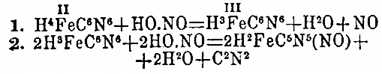 (хим.) или нитрозо-, а также нитропруссиды — замечены впервые Л. Гмелином. Если растворить желтую соль (см.) в разведенной азотной кислоте [Берут (Wild) 8 весов. частей желтой соли в порошке, обливают 12 ч. воды и прибавляют 15 ч. азотной кислоты уд. в. 1,24] и подвергнуть этот раствор слабому нагреванию, то выделяется циан, синильная кислота, углекислый газ, азот; раствор содержит азотно-кислые калий и железо и нитропруссидный калий K2FeC5N5(N O); так как эта соль дурно кристаллизуется, то прибавляют избыток соды и извлекают спиртом, который растворяет только натриевую соль, хорошо кристаллизующуюся в больших рубиново-красных кристаллах ромбической системы и обладающую составом Na 2FeC5N5(NO) + 2 Н 2 O (Жерар). Из этой соли двойным разложением можно получить другие соли, а из Ag 2FeC5N5 (NO), действием соляной кислоты, или из BaFeC 5N5.NO, действием серной, и нитропруссидную кислоту H2FeC5N5.NO, которая выделяется из водного раствора при испарении на холоде в темно-красных расплывчатых кристаллах. Эта кислота, получается также (Гадов, Штэделер) при действии азотистой кислоты на железисто-синеродисто-водородную в следующие две фазы: