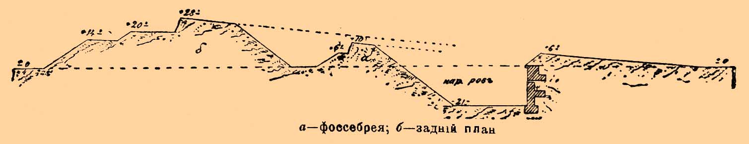 — пониженный вал впереди высокого главного вала оборонительной ограды, параллельный последнему. В фронтах нидерландских крепостей XVII в. Ф. служила позицией для настильной обороны водяного рва фронтальным ружейным огнем; затем появилась в фортах, построенных в 80-х годах прошлого столетия (см. Форт). Эти форты с двумя валами (из которых передний и есть Ф.) явились как результат опыта кампании 1877—78 гг., обнаружившей в полной мере могущество ружейного огня при отбитии штурма: турки, бедно снабженные артиллерией, наносили русским войскам огромные потери одним ружейным огнем (особенно под Плевной). Но так как в то время форты еще в изобилии снабжались крепостной артиллерией, то, желая дать им и обширную пехотную позицию, способную развить сильный ружейный огонь, — пришлось прибегнуть к профили с двумя валами, пехотным и артиллерийским (см. черт.).